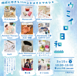地球に優しいハンドメイドマルシェ「ウミイロ日和_vol.19」を2025年3月15日(土)に開催します。 ウミイロ日和とは、地球の青【ウミイロ】がずっと続きますようにという願いを込め、地球環境を守る・考えるきっかけづくり […]