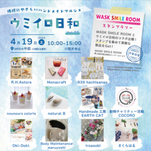 地球に優しいハンドメイドマルシェ「ウミイロ日和_vol.20」を2025年4月19日(土)に開催します。この日は特別に近隣で開催されている「WASK SMILE ROOM」とコラボし、スタンプラリーイベントを実施します。 […]