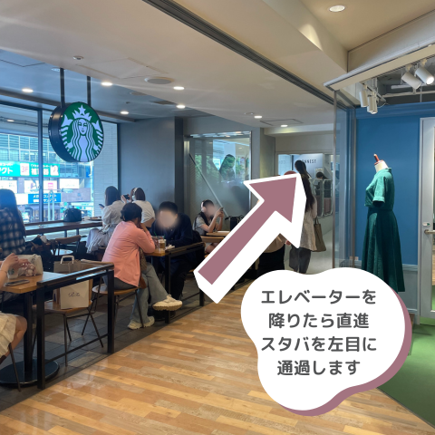 左側にスターバックスの入り口(自動ドア)がありますので、入ってすぐのエスカレーターに乗ってください。