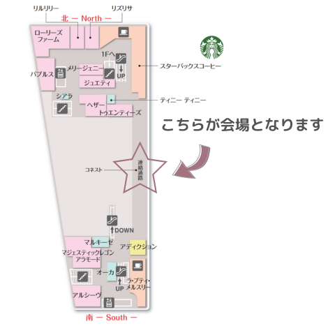 会場は北館と南館を結ぶ連絡通路となっており、隣には「スターバックスコーヒー ルミネエスト新宿店」があります。イベントの前後に美味しいコーヒーで一息着くこともできます。会場となるルミネエスト2Fのフロアガイドはこちら。