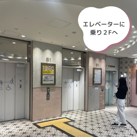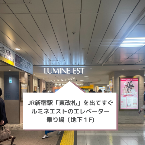 それでは早速、JR新宿駅「東改札」を出てからの道順をご紹介します。東口改札を出てすぐに「ルミネエスト」の文字が見えてきます。エレベーター乗り場となっていますので、ここからの道のりが一番簡単なのでおすすめです。「中央東改札」を出た場合は、改札を出て左に直進すると見えてきます。